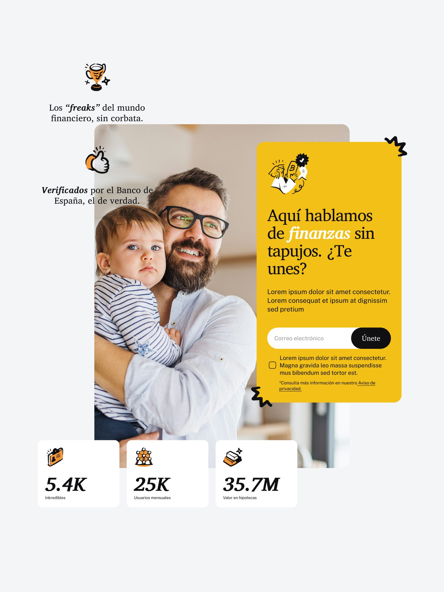 Para que una marca financiera conecte, debe ser tan profesional como humana. Por eso, diseñamos un sistema visual donde la tipografía busca la máxima legibilidad pero con un toque de calidez, combinando formas sólidas con detalles manuales que rompen la seriedad. Esta misma intención se traslada al uso del color, huimos del blanco aséptico para apoyarnos en un gris suave que aporta confort, utilizando una paleta vibrante y alegre para organizar la información y dar ritmo a la plataforma.